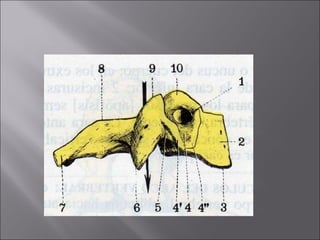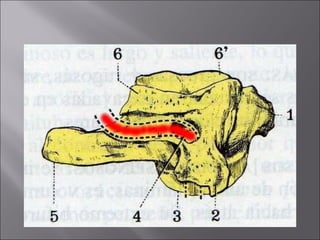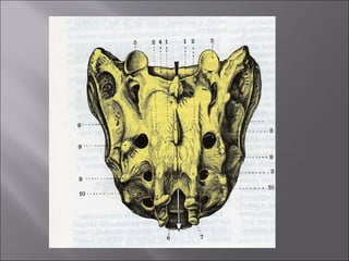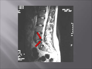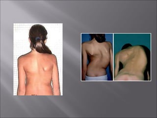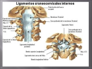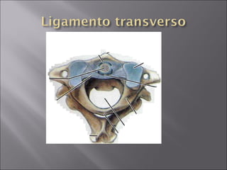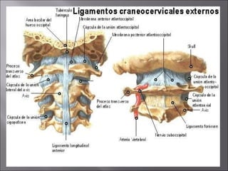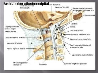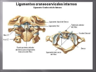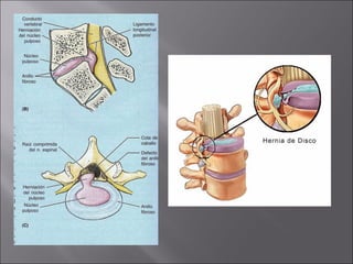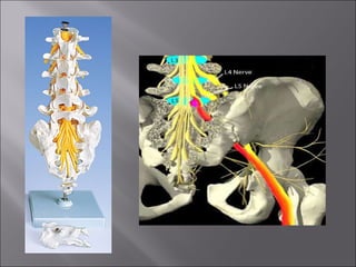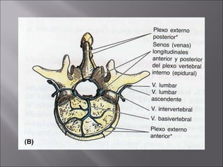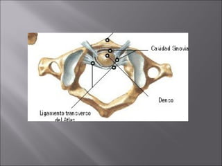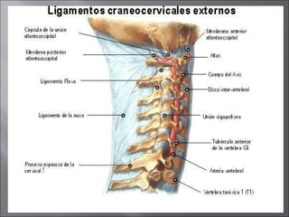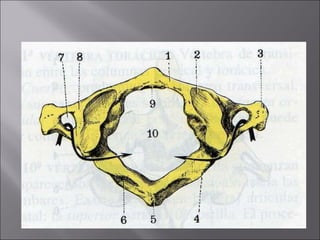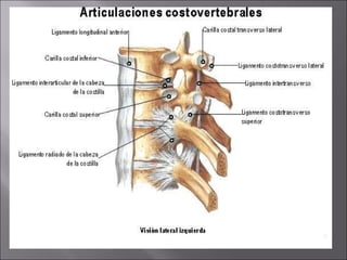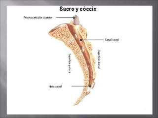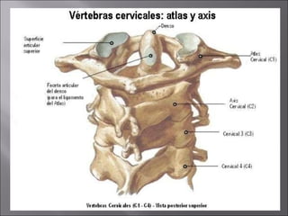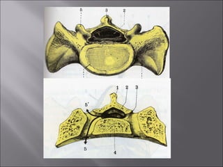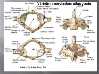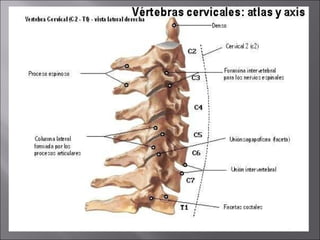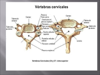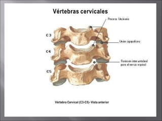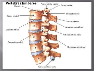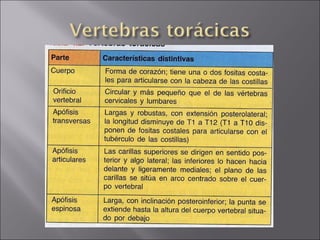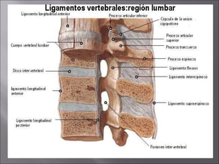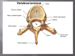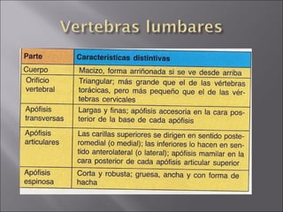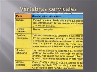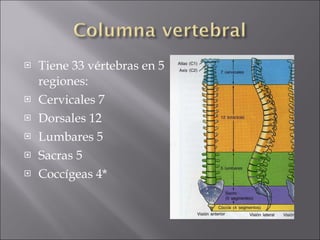 La columna vertebral está compuesta de 33 vértebras organizadas en 5 regiones que cumplen funciones de soporte del peso corporal, protección de la médula espinal y nervios, y permiten la postura y locomoción. Presenta 4 curvas fisiológicas y puede desarrollar anormalidades como cifosis, lordosis y escoliosis. Cada vértebra típica posee un cuerpo, arco, apófisis y orificios que se articulan entre sí mediante discos intervertebrales y son unidos por ligamentos.