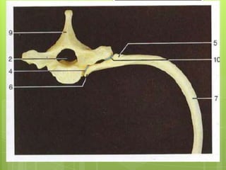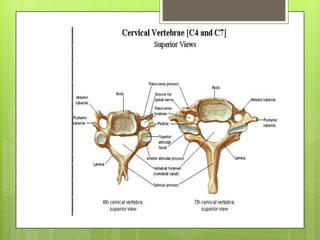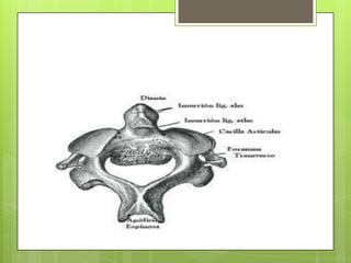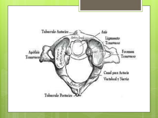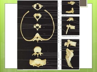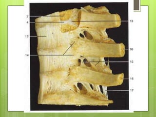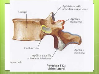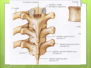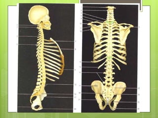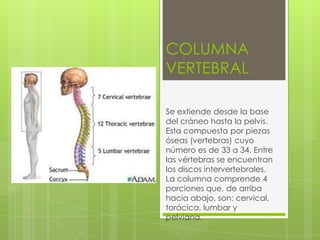 La columna vertebral se extiende desde la base del cráneo hasta la pelvis y está compuesta por 33-34 piezas óseas llamadas vértebras unidas por discos intervertebrales. Está dividida en 4 secciones - cervical, torácica, lumbar y pelviana. Protege la médula espinal, soporta el peso del cuerpo y permite cierta flexibilidad y movimiento.
