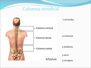 La columna vertebral humana está compuesta por 7 vértebras cervicales, 12 torácicas, 5 lumbares, el sacro formado por la fusión de 5 vértebras, y 5 vértebras coccígeas. Las vértebras tienen partes como el cuerpo y los procesos transversos y espinosos, y varían en tamaño y forma según su ubicación. El atlas y el axis son las primeras vértebras cervicales y tienen características únicas como el diente del axis. Las torácicas tienen superficies artic