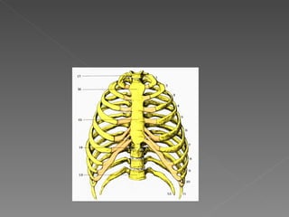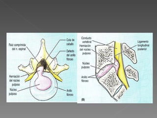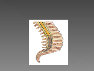 La columna vertebral es un tallo óseo ubicado en la línea media posterior del cuello y el tronco que protege la médula espinal y sirve de apoyo a las vísceras. Está formada por 33-34 vértebras que se dividen en porciones cervical, dorsal, lumbar, sacra y coxígea. Cada vértebra presenta características comunes como el cuerpo vertebral y el agujero vertebral, pero sus características específicas varían según la región de la columna a la que pertenecen.