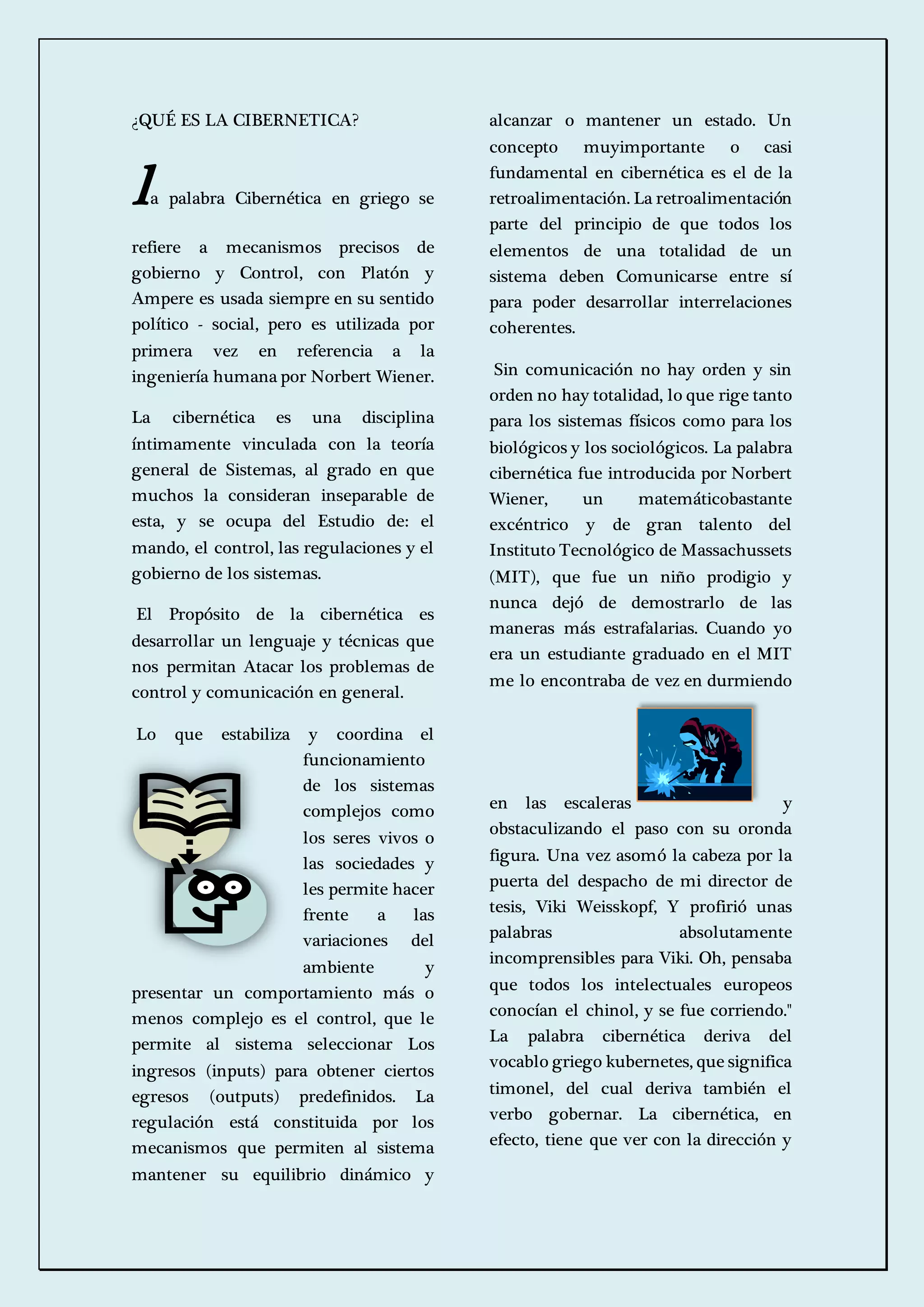 La cibernética estudia el control y gobierno de sistemas complejos. Se ocupa de conceptos como la retroalimentación y regulación para mantener el equilibrio dinámico de un sistema. La palabra cibernética fue acuñada por Norbert Wiener para referirse al control de autómatas.