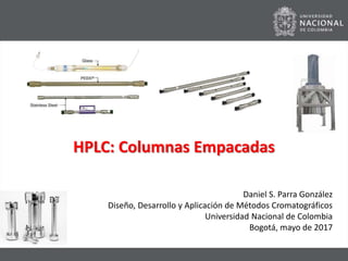 Este documento describe las partes principales de las columnas empacadas de HPLC, incluyendo el soporte, las fases estacionarias y los tipos de empaques. Explica que la sílice es el soporte más común debido a su resistencia mecánica y estabilidad química. Las fases estacionarias más utilizadas son las de carbono de cadena larga como C18 para separaciones de retención de fase reversa. El documento también cubre otros soportes como alúmina, zircónio y metacrilato.