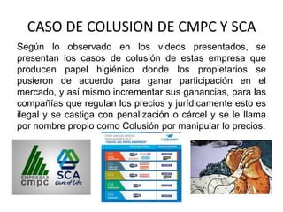 El documento trata sobre la colusión en Colombia. Explica que CMPC y SCA se pusieron de acuerdo para ganar participación en el mercado de papel higiénico, lo cual es ilegal. También menciona que casos comunes de colusión en Colombia incluyen los pañales producidos por la misma compañía CMPC y los "hermanos Nule" que manipulan licitaciones. Finalmente, señala que en Colombia la colusión se considera un delito, aunque los procesos suelen ser largos y las personas involucradas se ponen