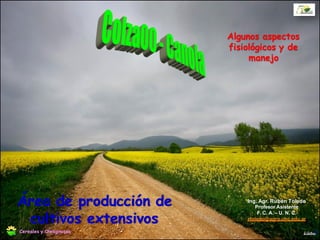 El documento presenta información sobre la producción de colza, incluyendo estadísticas de producción mundial y nacional, etapas de desarrollo del cultivo, factores que influyen en el desarrollo, manejo del cultivo, plagas e insectos comunes, y detalles sobre la cosecha.