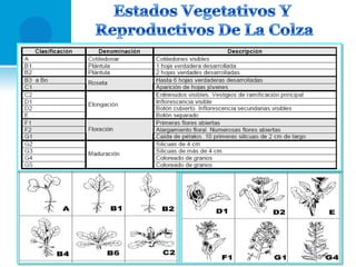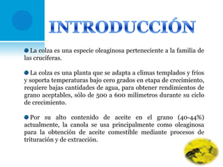 La colza es una planta oleaginosa cultivada principalmente para la obtención de aceite. Requiere climas templados y soporta temperaturas bajo cero. Su grano contiene un alto contenido de aceite (40-44%) que se extrae mediante procesos industriales. La colza convencional produce un aceite con alto contenido de ácido erúcico, pero variedades como la canola tienen niveles reducidos y son aptas para consumo.