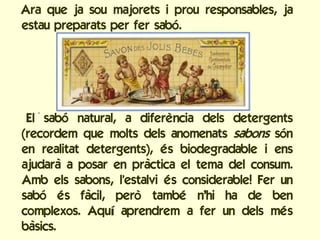 Este documento ofrece instrucciones para hacer jabón de manera natural y segura en casa. Explica los pasos para mezclar agua con sosa cáustica para producir lejía, y luego agregar aceites y mantecas vegetales para formar la masa de jabón. También cubre medidas de seguridad y da una receta básica de jabón de oliva y coco como ejemplo.