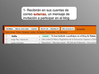 Este documento proporciona una guía paso a paso para acceder a un edublog grupal. Los usuarios recibirán una invitación por correo electrónico con un enlace para registrarse en Blogger y aceptar la invitación al blog. Deberán usar la misma dirección de correo electrónico que usaron para la invitación, establecer una contraseña, y completar los detalles de su perfil. Una vez registrados, podrán acceder al panel de Blogger y publicar nuevas entradas en el blog grupal como autores.
