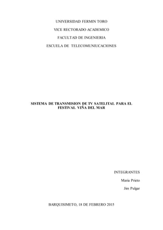 Este documento describe un sistema de transmisión de televisión por satélite para transmitir el Festival de Viña del Mar a Guatemala y Venezuela. El sistema incluye una estación emisora en Chile que envía la señal al satélite seleccionado, el cual la retransmite a las estaciones receptoras en los otros países. El satélite escogido debe ser geoestacionario y contar con el ancho de banda necesario. La señal es recibida por antenas parabólicas y equipos que la convierten a un formato aceptable para la televisión.