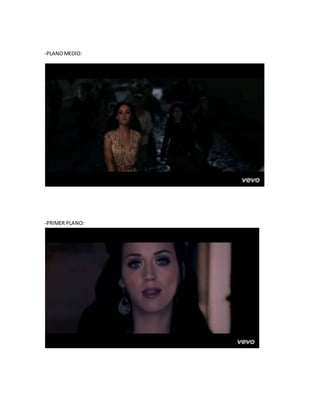 El documento analiza elementos técnicos del videoclip musical "Firework" de Katy Perry, incluyendo planos generales, americanos, medios y primeros planos que muestran ángulos de picado y contrapicado, así como el uso de luz artificial.