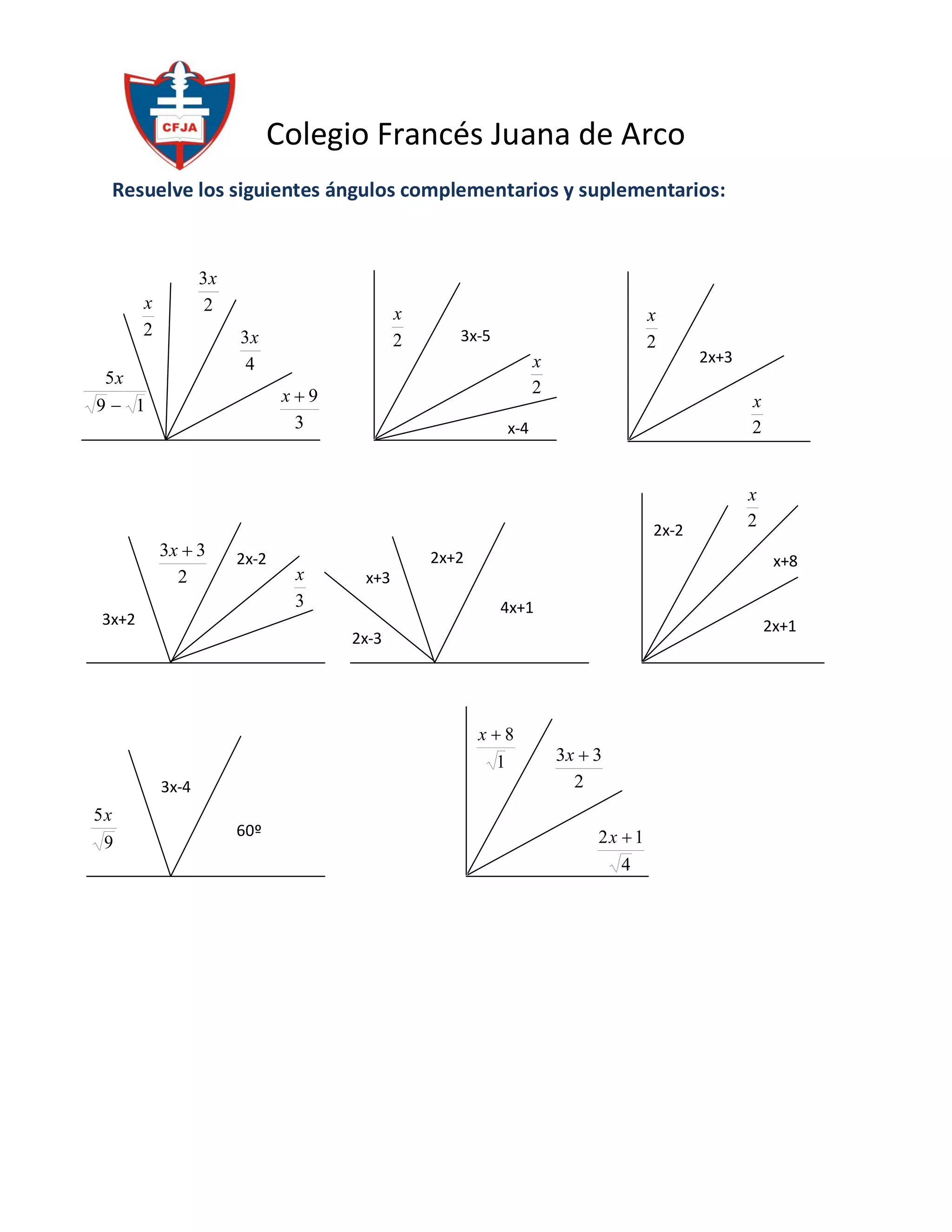 Este documento presenta una serie de ángulos complementarios y suplementarios y pide que se resuelvan. Contiene expresiones angulares como 3x, 2x+3, x-4 y fracciones angulares como 3x/2 que deben resolverse encontrando los ángulos complementarios y suplementarios correspondientes.