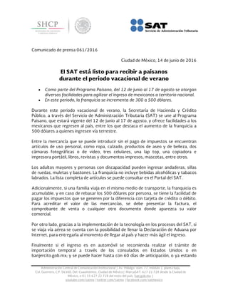 COMUNICADO DE PRENSA SAT Ciudad de México, a 14 de junio de 2016 El SAT está listo para recibir a paisanos durante el periodo vacacional de verano