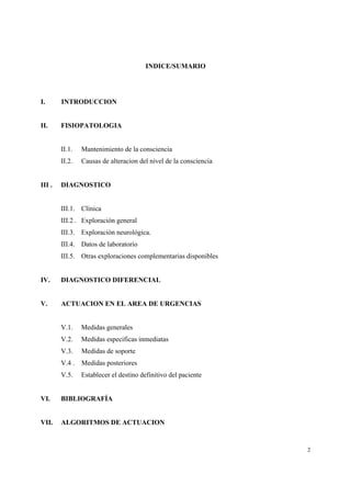 El documento proporciona información sobre el diagnóstico y manejo del coma en el área de urgencias. Explica que el coma se define como la ausencia de respuesta a estímulos, y describe las causas fisiopatológicas como lesiones cerebrales o del tronco encefálico. Detalla la evaluación clínica incluyendo la escala de Glasgow, exámenes neurológicos como la motilidad ocular y respiratoria, y signos motores.