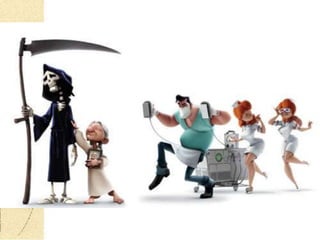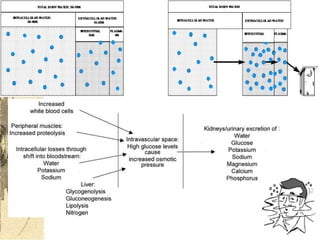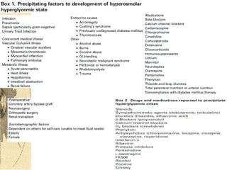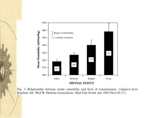 Este documento presenta el caso de un paciente de 95 años que ingresó en el hospital con un estado de coma hiperglucémico hiperosmolar. El paciente tenía una historia de diabetes tipo 2 mal controlada y no había estado tomando su insulina ni comiendo. Los análisis de laboratorio mostraron niveles extremadamente altos de glucosa y osmolaridad, así como insuficiencia renal. El tratamiento consistió en rehidratación intravenosa, administración de insulina y control estricto de los niveles de glucosa y electrolitos.