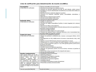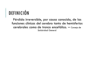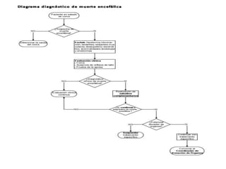 El documento detalla los criterios y procedimientos para determinar la muerte cerebral, incluyendo la ausencia de respuesta a estímulos, apnea y electroencefalograma isoeléctrico. También se abordan las consideraciones médicas y legales relacionadas con la muerte cerebral, así como su diferenciación de otros estados como la descerebración. Se presentan diferentes protocolos y estudios complementarios necesarios para confirmar el diagnóstico de muerte cerebral.
