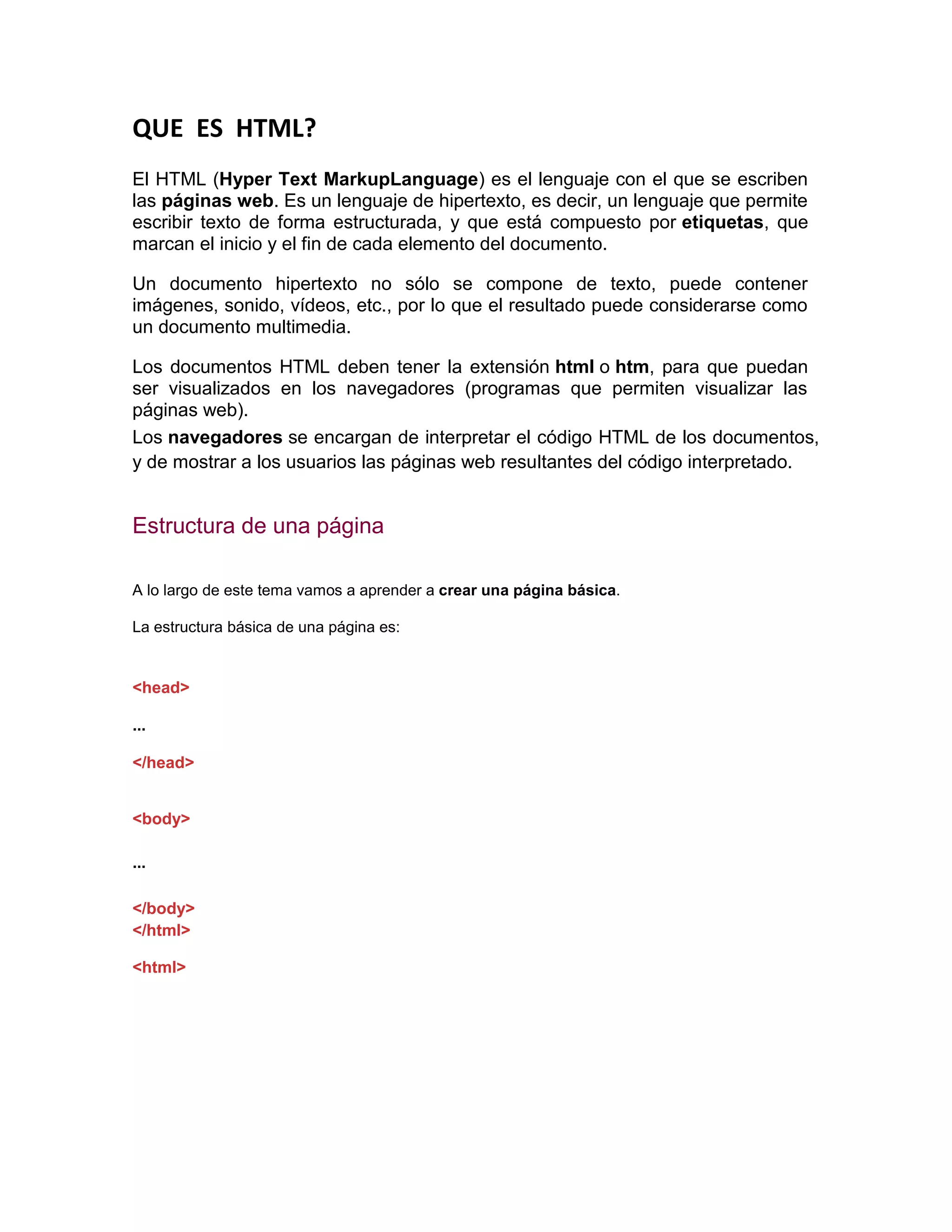 El HTML es el lenguaje usado para crear páginas web. Es un lenguaje de hipertexto compuesto por etiquetas que marcan los elementos de un documento, el cual puede contener texto, imágenes, video y sonido. Los navegadores interpretan el código HTML para mostrar las páginas web a los usuarios.