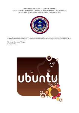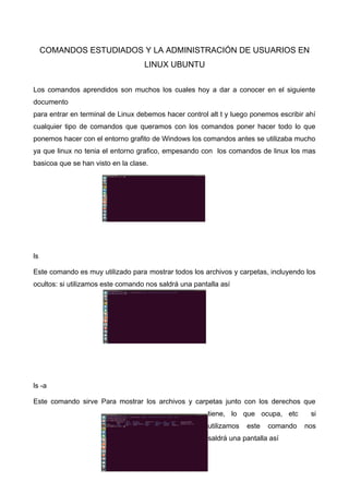 Este documento describe varios comandos básicos de Linux Ubuntu como ls, cd, clear y ps. Explica que ls se usa para mostrar archivos y carpetas, cd para cambiar de directorio, clear para limpiar la pantalla y ps para ver los procesos en ejecución. También cubre comandos como sudo para ejecutar tareas de administrador y useradd para crear nuevos usuarios. El objetivo es proporcionar una introducción a la administración básica de usuarios y el uso de comandos de línea de comandos en Linux.