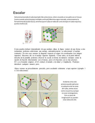 El documento explica los diferentes tipos de barras de herramientas en SketchUp y las herramientas que contienen cada una. Describe las barras de herramientas Primeros pasos, Opciones avanzadas de cámara, Cámara, Clasificador, Construcción, Dibujar, Componentes dinámicos, Editar y de Google, así como el conjunto grande de herramientas.