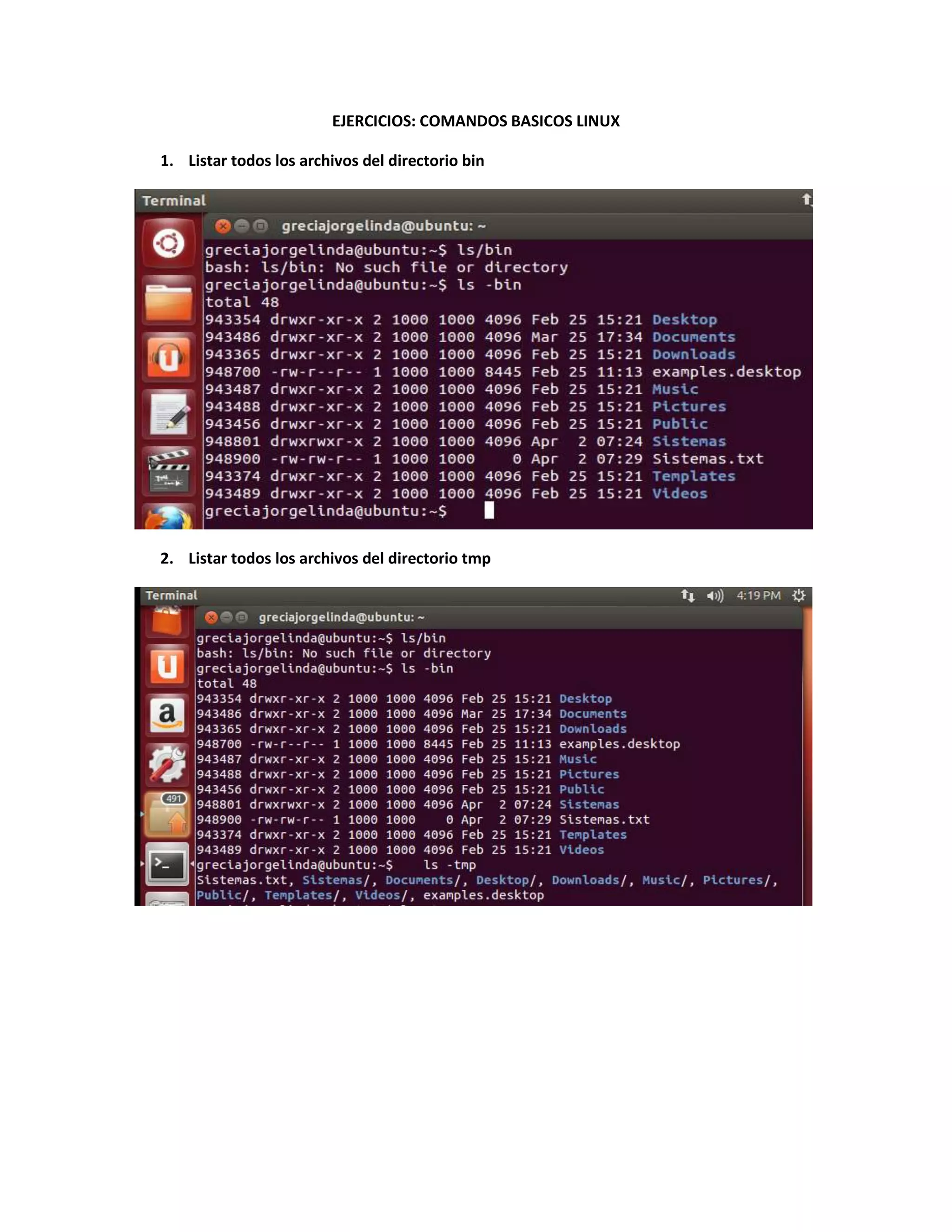 Este documento proporciona una lista de 22 ejercicios para practicar comandos básicos de Linux como listar archivos y directorios, cambiar de directorio, crear directorios y subdirectorios, copiar y mover archivos y directorios. Los ejercicios cubren comandos como ls, cd, mkdir, cp y mv.