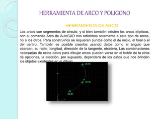 Los arcos son segmentos de círculo y se pueden dibujar de varias formas en AutoCAD, como a través de tres puntos, el centro y los puntos inicial y final, o usando datos como el ángulo o radio. Los polígonos regulares como cuadrados y pentágonos pueden crearse usando la herramienta Polígono especificando el centro, número de lados y si será inscrito o circunscrito a un círculo. Los comandos Arc, Move, Copy y Distance permiten respectivamente dibujar arcos, mover objetos,