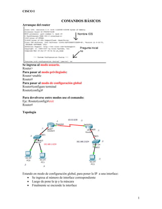 El documento proporciona instrucciones sobre comandos básicos de Cisco para configurar routers y switches. Explica cómo acceder a diferentes modos, configurar interfaces de red, DHCP, VLAN, usuarios, enrutamiento estático y dinámico RIP.