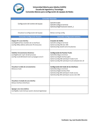 Este documento proporciona comandos básicos para configurar equipos de redes como routers y switches, incluyendo cómo asignar una dirección IP a una interfaz, crear VLANs, habilitar enrutamiento dinámico OSPF, configurar puertos trunk, visualizar tablas de enrutamiento e interfaces, y agregar rutas estáticas. El documento también explica cómo cambiar el nombre del equipo y ver la configuración corriente.