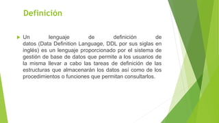 Un lenguaje de definición de datos (DDL) permite a los usuarios definir las estructuras de almacenamiento de datos y consultar procedimientos en una base de datos. Utiliza verbos como CREATE, ALTER y DROP para crear, modificar y eliminar objetos de base de datos como tablas, índices y bases de datos. Proporciona ejemplos de sentencias DDL como CREATE TABLE, ALTER TABLE y DROP INDEX.