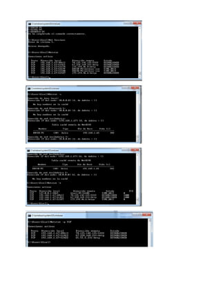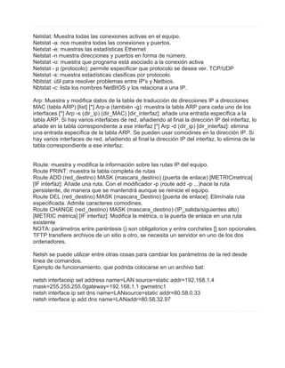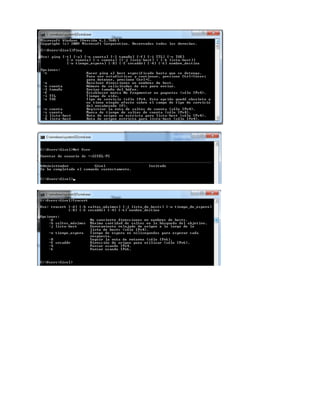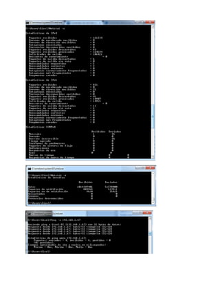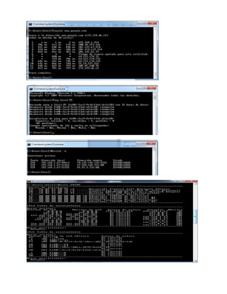 Este documento describe varios comandos de red comúnmente utilizados en sistemas operativos como Windows y Linux. Algunos de los comandos más importantes incluyen ping para comprobar la conectividad, tracert/traceroute para ver la ruta a un destino, ifconfig/ipconfig para ver la configuración de red, y netstat para ver estadísticas de red y conexiones. Estos comandos ayudan a diagnosticar problemas de red y monitorear el tráfico de red.