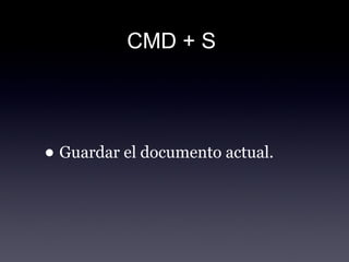 Este documento lista comandos de teclado comunes en MacOS, incluyendo CMD + S para guardar, CMD + C para copiar, CMD + V para pegar, y CMD + Q para salir de una aplicación. También describe comandos para tomar capturas de pantalla, deshacer/rehacer acciones, imprimir, seleccionar todo, buscar, y poner las pantallas en reposo.