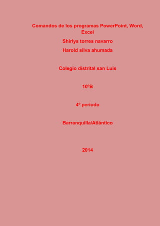 Este documento proporciona una lista extensa de comandos y herramientas de los programas Microsoft Word, PowerPoint y Excel. Incluye comandos para formato de texto, estilos, edición, inserción de imágenes, tablas, vínculos, encabezados, pies de página y más en Word. También cubre temas, diseño de páginas y organización de objetos.