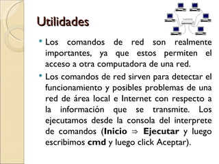 Este documento describe varios comandos de red comunes como ipconfig, ping, tracert y netstat, los cuales permiten verificar la configuración de red, comprobar la conectividad, identificar la ruta a otros dispositivos de red y ver las conexiones de red activas. Explica también otros comandos como net que permiten ver recursos compartidos, equipos en la red local y sesiones de red activas. El objetivo es ayudar a diagnosticar y solucionar problemas de red.