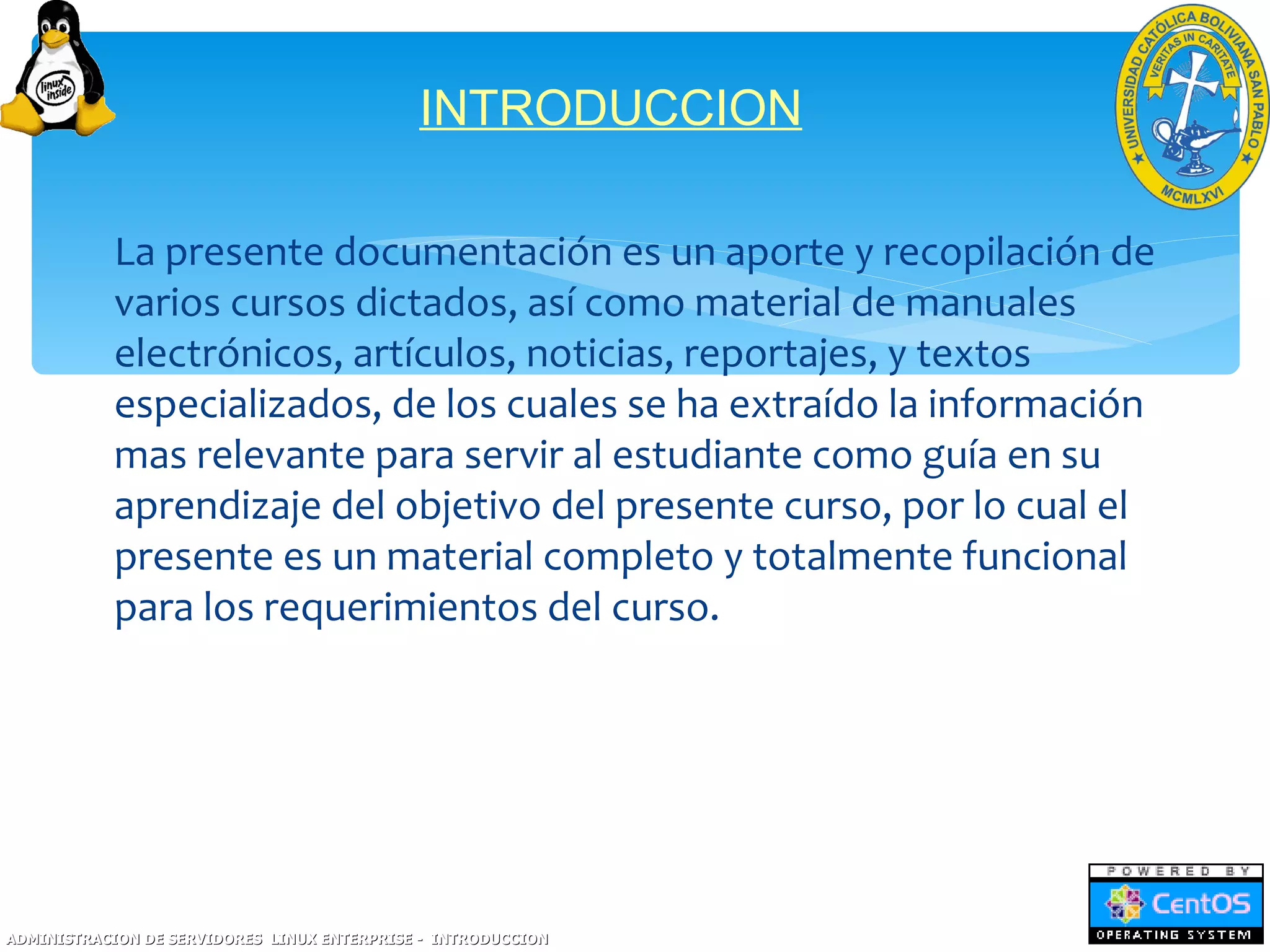 Este documento presenta una introducción a la administración de sistemas Linux CentOS. Explica qué es CentOS, revisa comandos básicos de Linux como ls, cd y mount, y cubre temas como inicio y apagado del sistema, búsqueda de archivos, y movimiento de archivos. El objetivo es proporcionar información introductoria para nuevos administradores de sistemas Linux CentOS.