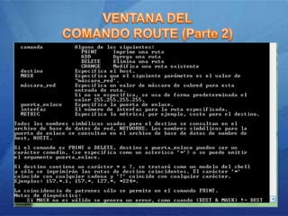 Este documento proporciona una guía sobre el uso de comandos de red en Windows. Brevemente describe comandos como route, net share, net view y ping que se utilizan para visualizar y modificar tablas de rutas, compartir recursos de red, ver otros equipos en la red y probar la conectividad, respectivamente. También cubre el uso de herramientas como ipconfig y nbtstat para ver la configuración de red y realizar pruebas de nombre de red.