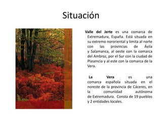 Este documento describe dos comarcas en Extremadura, España: el Valle del Jerte y la Vera. El Valle del Jerte limita al norte con Ávila y Salamanca, y al oeste con la comarca de Ambroz. La Vera se encuentra en el noreste de Cáceres. El documento menciona algunas atracciones turísticas como el Monasterio de Yuste y la Garganta de los Infiernos, y productos típicos como la cereza del Valle del Jerte y el pimentón de la Vera.
