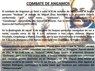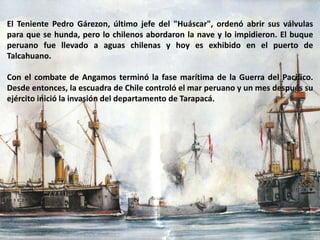 El 8 de octubre de 1879 tuvo lugar el combate naval de Angamos entre el buque peruano Huáscar, al mando de Miguel Grau, y la escuadra chilena. A pesar de la resistencia del Huáscar y la muerte de Grau, el buque peruano resultó gravemente dañado y se hundió, dando por terminada la fase marítima de la Guerra del Pacífico a favor de Chile.