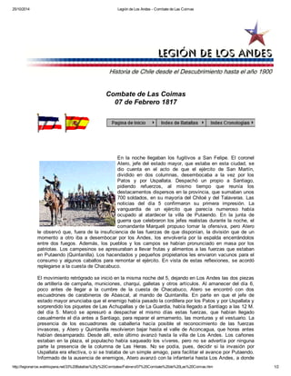 El documento describe un combate entre fuerzas realistas y patriotas en Las Coimas, cerca de San Felipe, Chile el 7 de febrero de 1817. Las fuerzas realistas bajo el mando del coronel Atero atacaron un campamento patriota de 600 hombres mandados por el teniente coronel Mariano Necochea. El combate fue breve, con la caballería patriota derrotando y poniendo en fuga a la caballería realista. Aunque los realistas sufrieron unas 20 bajas, se vieron obligados a retirarse de San Felipe y Los Andes ante