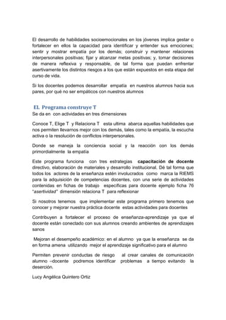 El documento habla sobre la importancia de que los docentes desarrollen empatía hacia los estudiantes adolescentes. Explica que algunos estudiantes dejan la escuela porque no se sienten a gusto o entendidos. Propone que los docentes se pongan en el lugar de los estudiantes y los ayuden de una manera colaborativa para que el proceso de enseñanza sea más fluido. También describe programas como "Construye T" que se enfocan en desarrollar habilidades socioemocionales en los estudiantes a través del desarrol