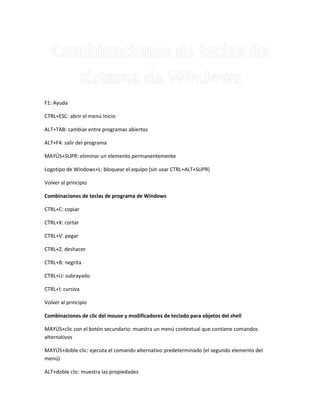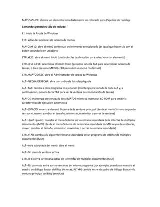Este documento proporciona una lista extensa de combinaciones de teclas y atajos de teclado para Windows. Algunas de las combinaciones más comunes incluyen CTRL+C para copiar, CTRL+V para pegar, ALT+TAB para cambiar entre programas abiertos, y MAYÚS+F10 para abrir un menú contextual. También se describen atajos para navegar carpetas, propiedades, cuadros de diálogo y más funciones del sistema operativo.