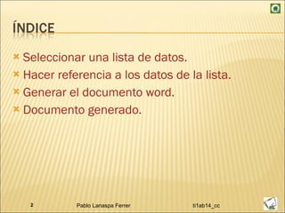Este documento proporciona instrucciones para generar un documento Word personalizado para múltiples destinatarios utilizando datos de una lista. Explica cómo seleccionar una lista de datos, insertar campos combinados para replicar datos variables, editar la lista de destinatarios, y combinar todos los registros para crear documentos individualizados para cada destinatario.