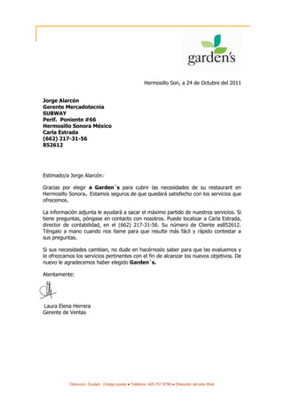Garden's envió cuatro cartas idénticas a cuatro restaurantes en Hermosillo Sonora agradeciéndoles por elegirlos para cubrir sus necesidades y ofreciéndoles información sobre sus servicios y contactos en caso de tener preguntas.