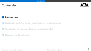 Este documento presenta una introducción a los circuitos combinacionales. Se divide en cuatro secciones principales: 1) introducción, 2) modelado analítico de circuitos lógicos combinacionales, 3) simulación de circuitos lógicos combinacionales y 4) bloques combinacionales. La segunda sección explica cómo modelar analíticamente un circuito lógico mediante tablas de verdad, funciones booleanas y su implementación con compuertas lógicas. Se incluyen ejemplos como un circuito mayoría y complemento a uno.