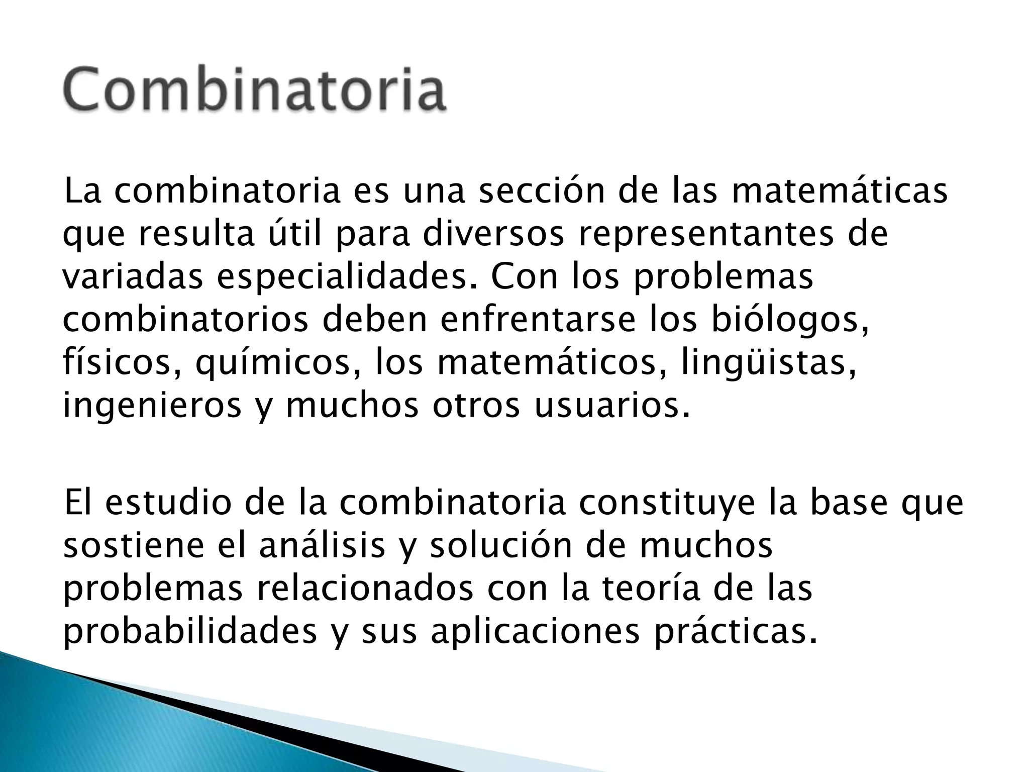 Este documento trata sobre la combinatoria y su historia. Explica que la combinatoria estudia las diversas formas de agrupar elementos de un conjunto y cuantificar esas combinaciones. También describe los principales tipos de problemas combinatorios como variaciones y combinaciones, y los principios fundamentales como la suma y el producto para resolver problemas. Además, traza los orígenes de la combinatoria en los juegos de azar y su desarrollo en los siglos XVI y XVII gracias a matemáticos como Pascal, Fermat y otros.