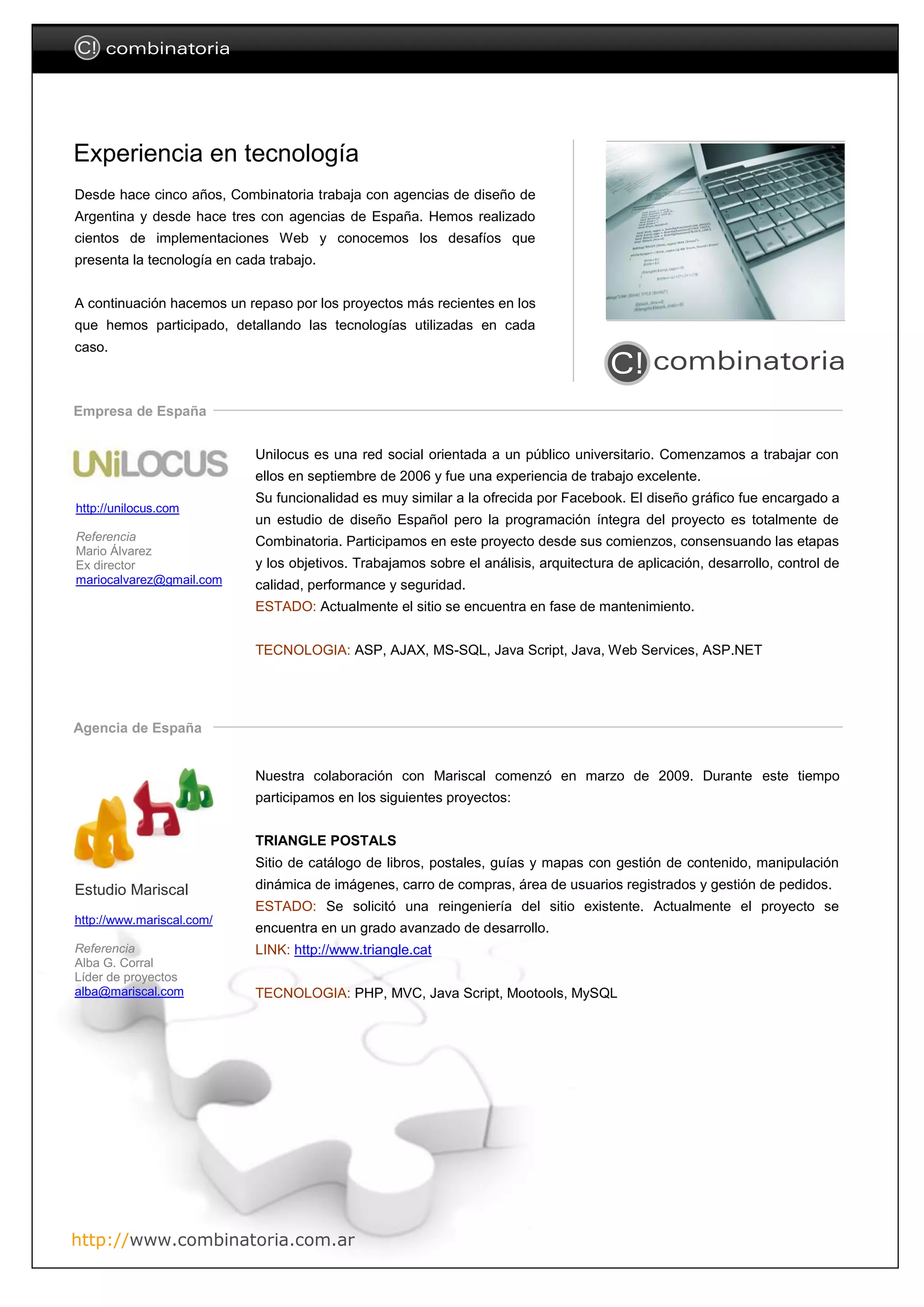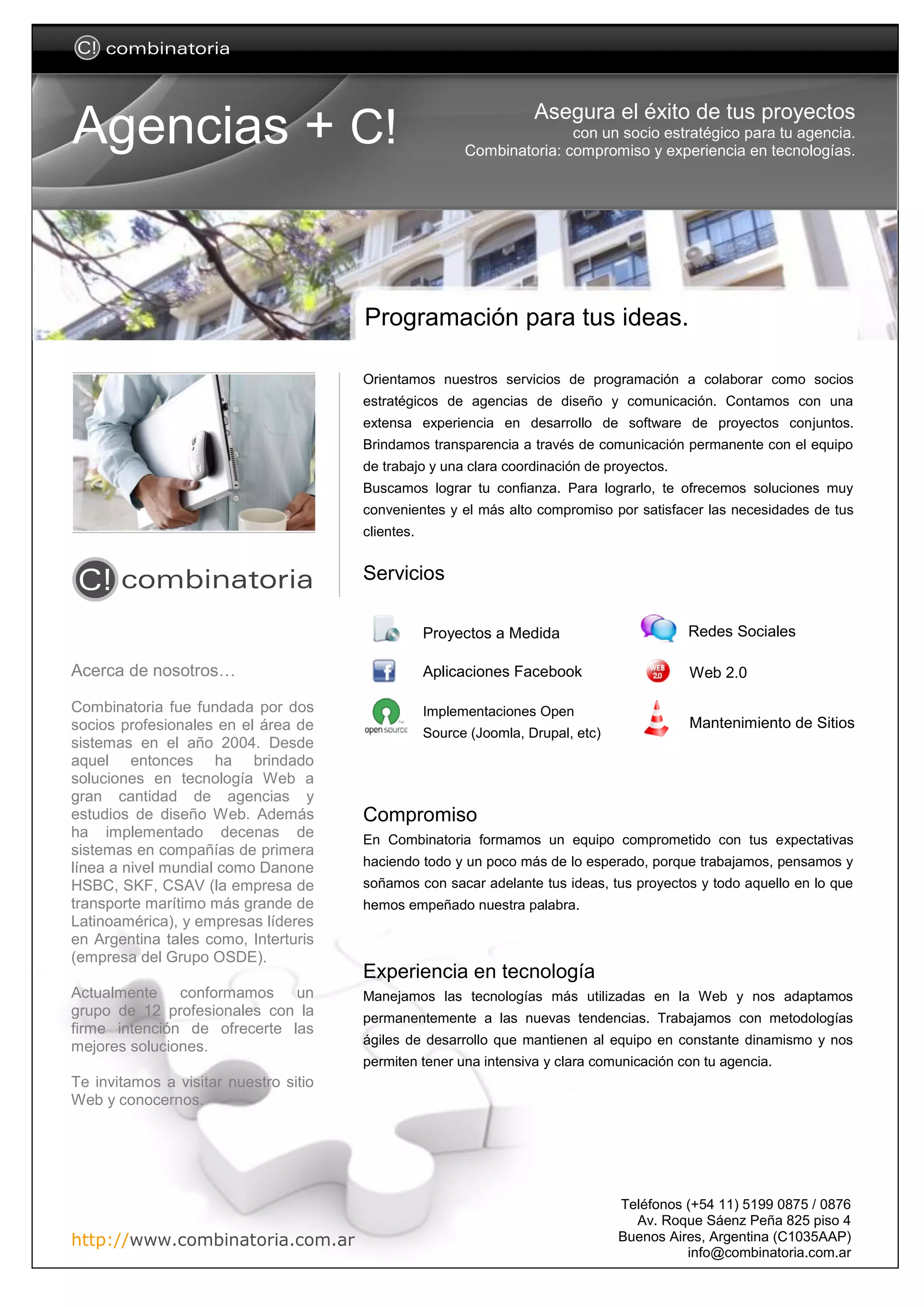 El documento presenta a Combinatoria como una empresa dedicada al desarrollo de software y socios estratégicos de agencias de diseño y comunicación. Detalla los servicios que ofrece como el desarrollo de proyectos a medida, aplicaciones para redes sociales y mantenimiento de sitios. Además, resume varios proyectos realizados con agencias de Argentina y España en los últimos años utilizando diversas tecnologías.