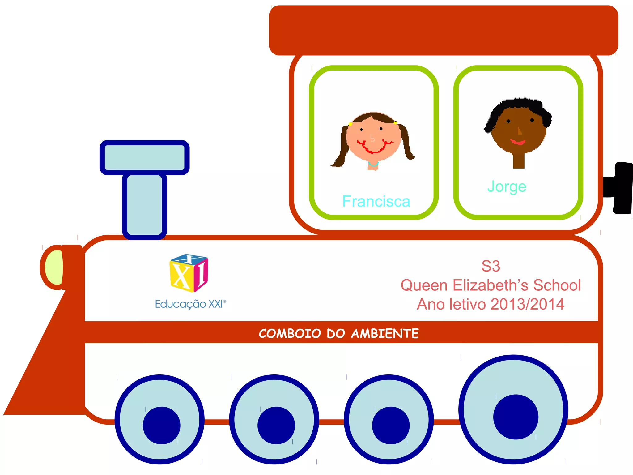 El documento contiene los nombres de Francisca y Jorge, la abreviatura S3 y el nombre de la escuela Queen Elizabeth's School. Parece ser un documento relacionado con un proyecto escolar llamado "Comboio do Ambiente" para el año escolar 2013/2014.