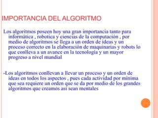 Este documento describe los conceptos de algoritmos y su importancia. Define un algoritmo como una secuencia de pasos lógicos para resolver un problema. Explica que los algoritmos se utilizan en informática para expresar instrucciones y resolver funciones. Además, clasifica los algoritmos según su sistema de signos, función y estrategia para llegar a una solución. Finalmente, incluye ejemplos de algoritmos cotidianos y cuantitativos.