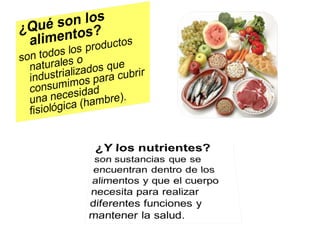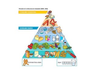 El documento trata sobre una alimentación saludable y equilibrada. Explica que una dieta variada que incluya 5 porciones diarias de frutas y verduras, alimentos ricos en fibra, pescado, y que reduzca las grasas y la sal es fundamental para gozar de buena salud. También enfatiza la importancia de realizar al menos 30 minutos de actividad física diaria.