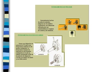 Este documento clasifica y describe los componentes electrónicos pasivos. Los divide en pasivos lineales como resistencias, capacitores y bobinas, y electromecánicos. Describe los tipos principales de resistencias como fijas, variables y no lineales, así como los códigos para identificar sus valores. Explica brevemente capacitores como los de plástico, cerámicos, mica y electrolíticos.