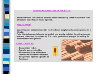 El documento presenta una clasificación de componentes electrónicos, dividiéndolos en pasivos y activos, y describe cada tipo con sus funciones y propiedades. En los componentes pasivos se incluyen resistencias, capacitores, bobinas y transformadores, mientras que los activos abarcan semiconductores y transductores. Se detalla el funcionamiento, aplicaciones y características específicas de cada componente, así como su simbología y métodos de identificación.