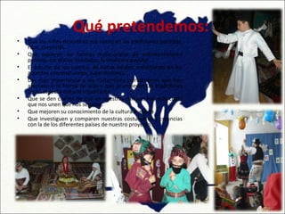 Este documento describe un proyecto educativo llamado Comenius que tiene como objetivo promover el conocimiento de las culturas europeas entre estudiantes. El proyecto involucra a estudiantes de varios países que comparten materiales e investigaciones sobre sus tradiciones, costumbres y creencias. A través de actividades como presentaciones, libros digitales, canciones y correspondencia, los estudiantes aprenden sobre las similitudes y diferencias entre las culturas europeas.