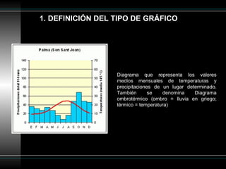 Este documento proporciona una guía para analizar y comentar climogramas. Explica cómo leer los datos de un climograma, incluyendo las precipitaciones, temperaturas y escalas. También describe cómo calcular valores como la temperatura media anual y la amplitud térmica. Además, detalla los pasos para analizar las precipitaciones, temperaturas y periodo de aridez. Por último, explica cómo determinar el hemisferio y tipo de clima basado en la información del climograma.