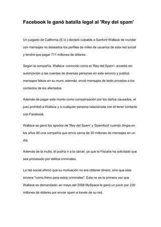 La corte de California declaró culpable a Sanford Wallace, conocido como el "Rey del spam", de acceder sin autorización a cuentas de Facebook y enviar mensajes falsos y spam. Se le ordenó pagar $711 millones en compensación y se le prohibió tener contacto con Facebook.